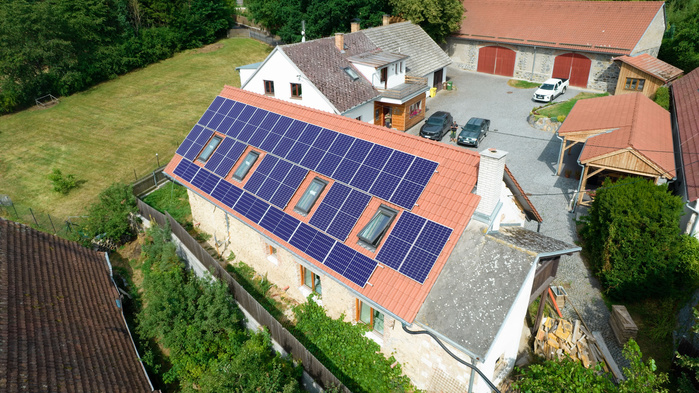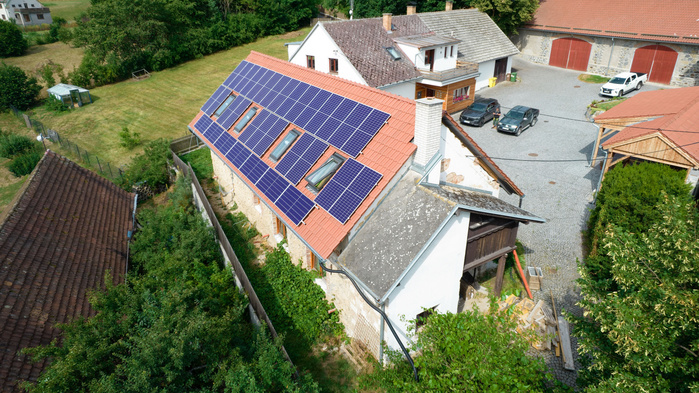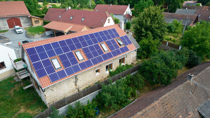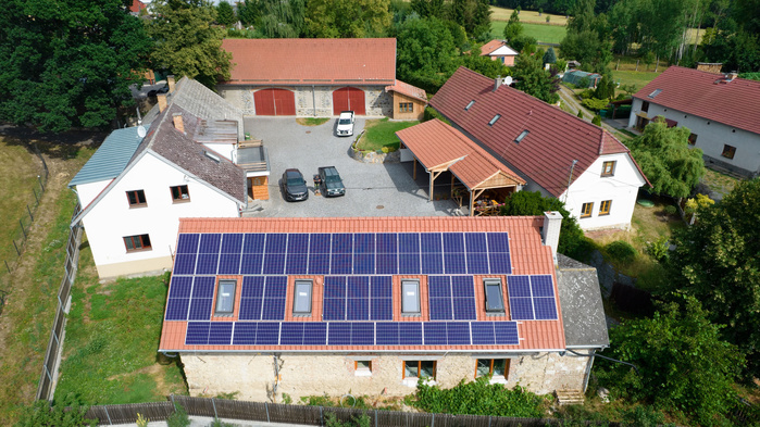 FVE výrobna o instalovaném výkonu 15,84 kW je nainstalována na střeše nově zrekonstruovaného rodinného domu (orientace na jih). Přebytky vyrobené elektřiny může majitel prodávat do distribuční sítě. V návaznosti na montáž výrobny budeme v rodinném domě instalovat i tepelné čerpadlo pro vytápění. Součástí instalace je i dobíjecí stanice elektromobilů. Na instalaci FVE a dobíječky majitel využil dotaci z programu Nová zelená úsporám.
